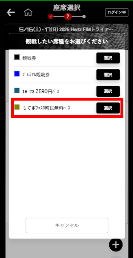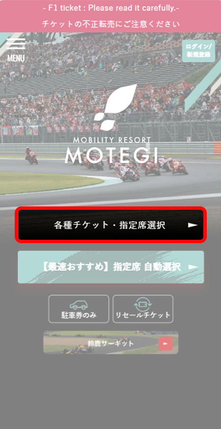 Please select "Mobility Resort Motegi" and proceed to the ticket selection screen.