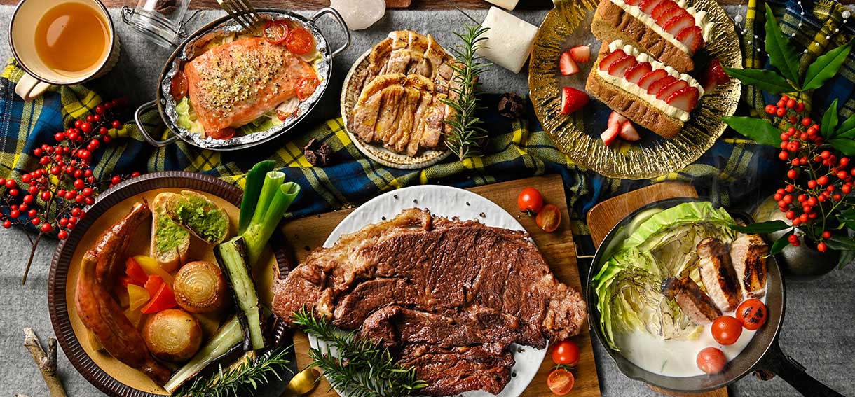 ボリューム満点のトマホークステーキやホテルのシェフが厳選した旬の食材を、家族や仲間で楽しめるプランです。