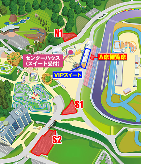 - ●N1指定駐車券をお持ちの方は必ず北ゲートより、S1指定駐車券・S2指定駐車券をお持ちの方は必ず南ゲートよりご入場ください。