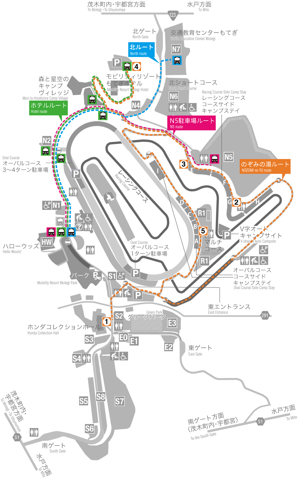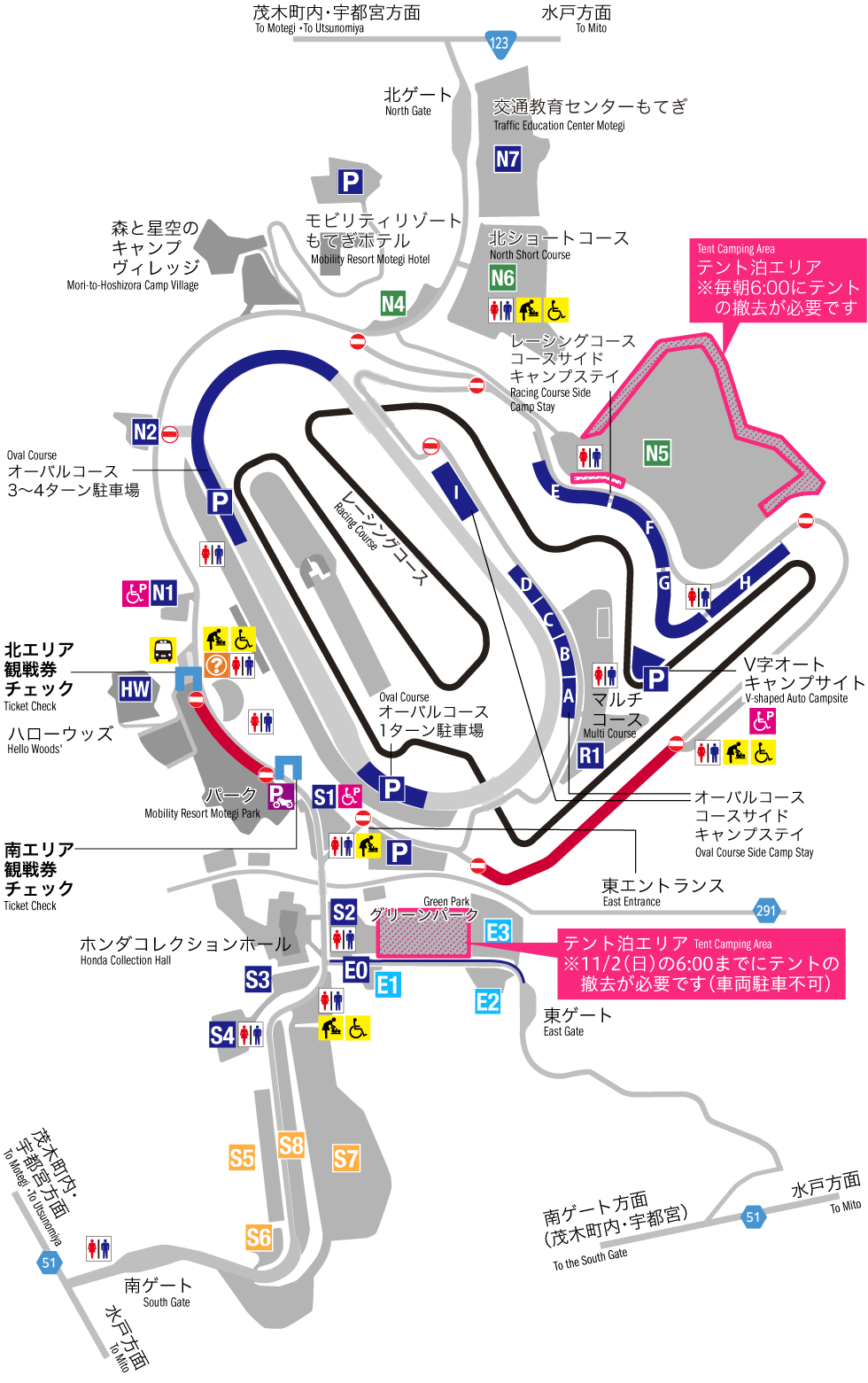 S1、S2、S3、S4、E0、東入口、橢圓賽道、橢圓賽道側露營區